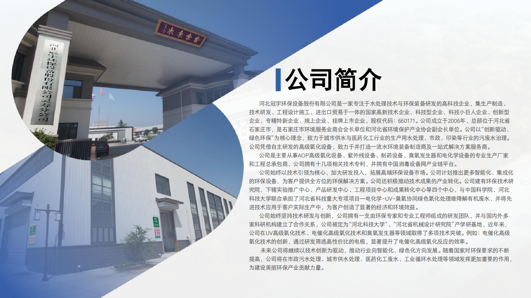 河北冠宇環保設備股份有限公司是一家專注于水處理技術與環保裝備研發的高科技企業,集生產制造、技術研發、工程設計施工、進出口貿易于一體的國家高新技術企業、科技型企業、科技小巨人企業、創新型企業、專精特新企業、規上企業、掛牌上市企業,股權代碼:660171。公司成立于2006年,總部位于河北省石家莊市,是石家莊市環境服務業商會會長單位和河北省環境保護產業協會副會長單位。公司以“創新驅動、綠色環保”為核心理念,致力于城市供水與醫藥化工行業的生產用水處理、市政、印染等行業的污廢水治理。公司憑借自主研發的高級氧化設備,致力于并打造一流水環境裝備制造商及一站式解決方案服務商。